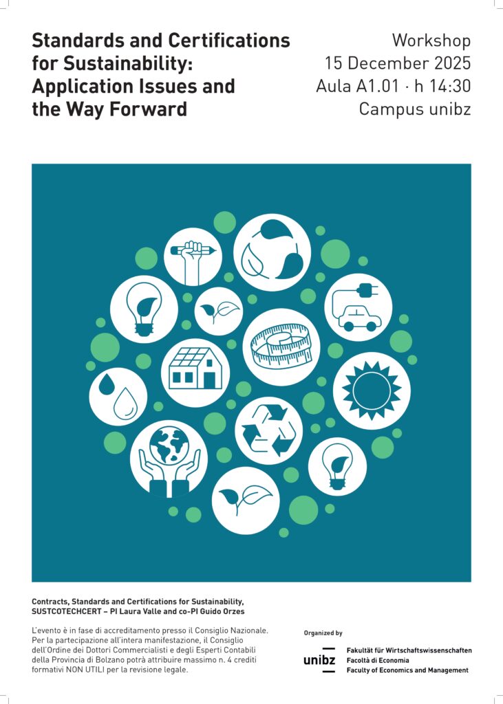 L’incontro ha come scopo la presentazione dei risultati preliminari del Progetto di Ricerca finanziato da unibz “Contracts, technical standards and certification systems for the effective development of sustainable economic relationships” e l’esperienza pratica di alcune imprese che hanno intrapreso un percorso di sostenibilità.